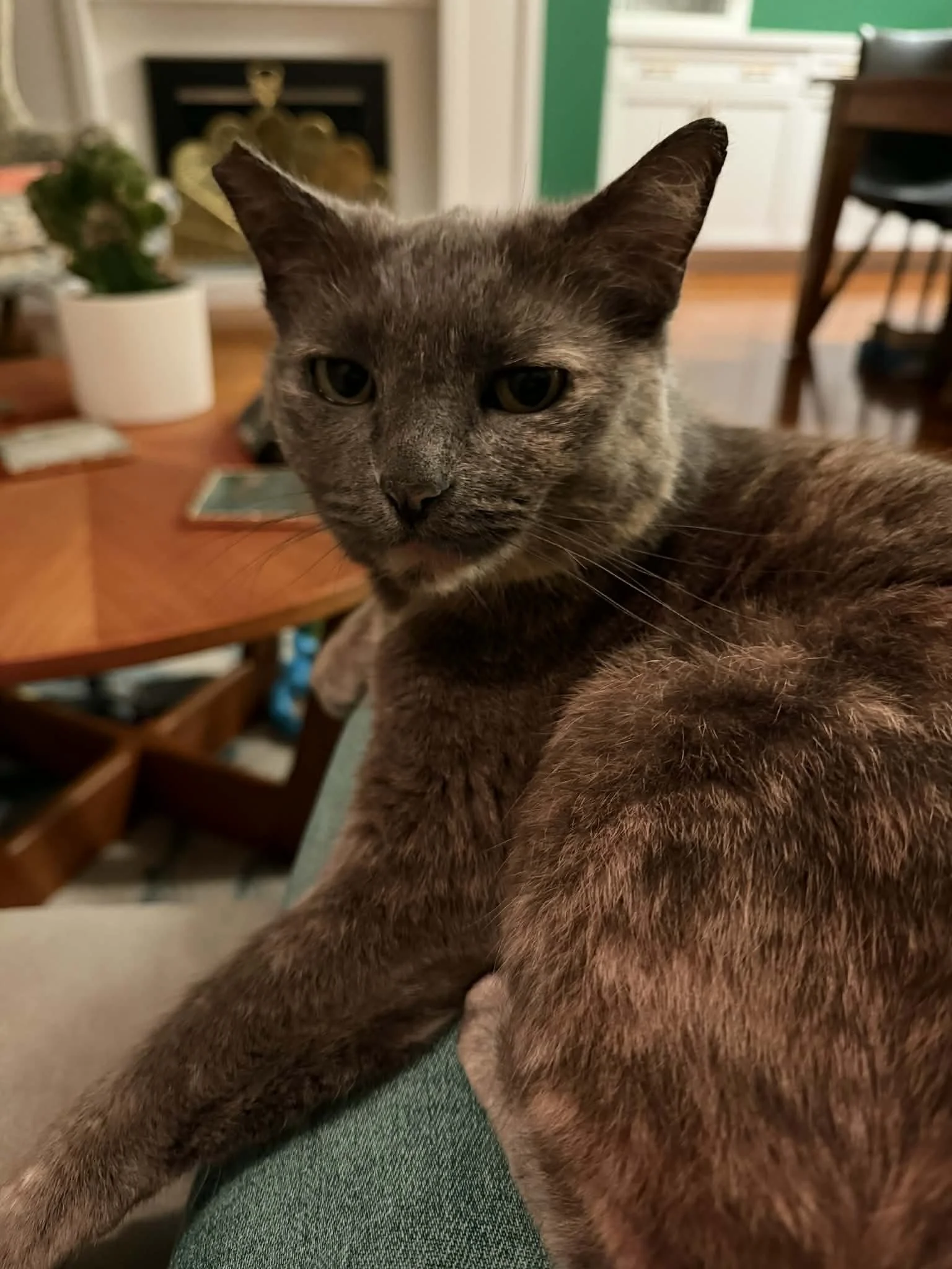 She was no longer a hider; she was a permanent part of the room’s peace. As the afternoon sun hit the peach-colored patches on her chin, Khloe began to vibrate with a low, rhythmic rumble—a purr that echoed the safety of the home she had found.